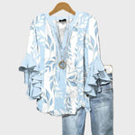 Renove o seu estilo de verão com esta blusa em tom azul-claro, decorada com elegantes padrões de folhas brancas. Os detalhes românticos nas mangas com folhos acrescentam movimento e feminilidade, enquanto o ajuste confortável proporciona facilidade e elegância em todos os momentos do dia.