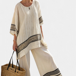 Estilo sereno com um toque náutico atemporal. O conjunto Daisy chama a atenção pela combinação de listras pretas contrastantes com o fundo natural, evocando uma elegância descontraída. Sua silhueta espaçosa e o tecido leve fazem dele o companheiro perfeito para climas quentes e dias tranquilos.