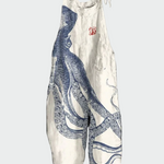 A peça "Chapéu de Polvo em Tela" combina arte e estilo em um item impressionante. Sobre um fundo branco natural, o desenho do polvo em azul de inspiração japonesa se destaca com detalhes delicados, criando uma aura marítima que atrai todos os olhares.